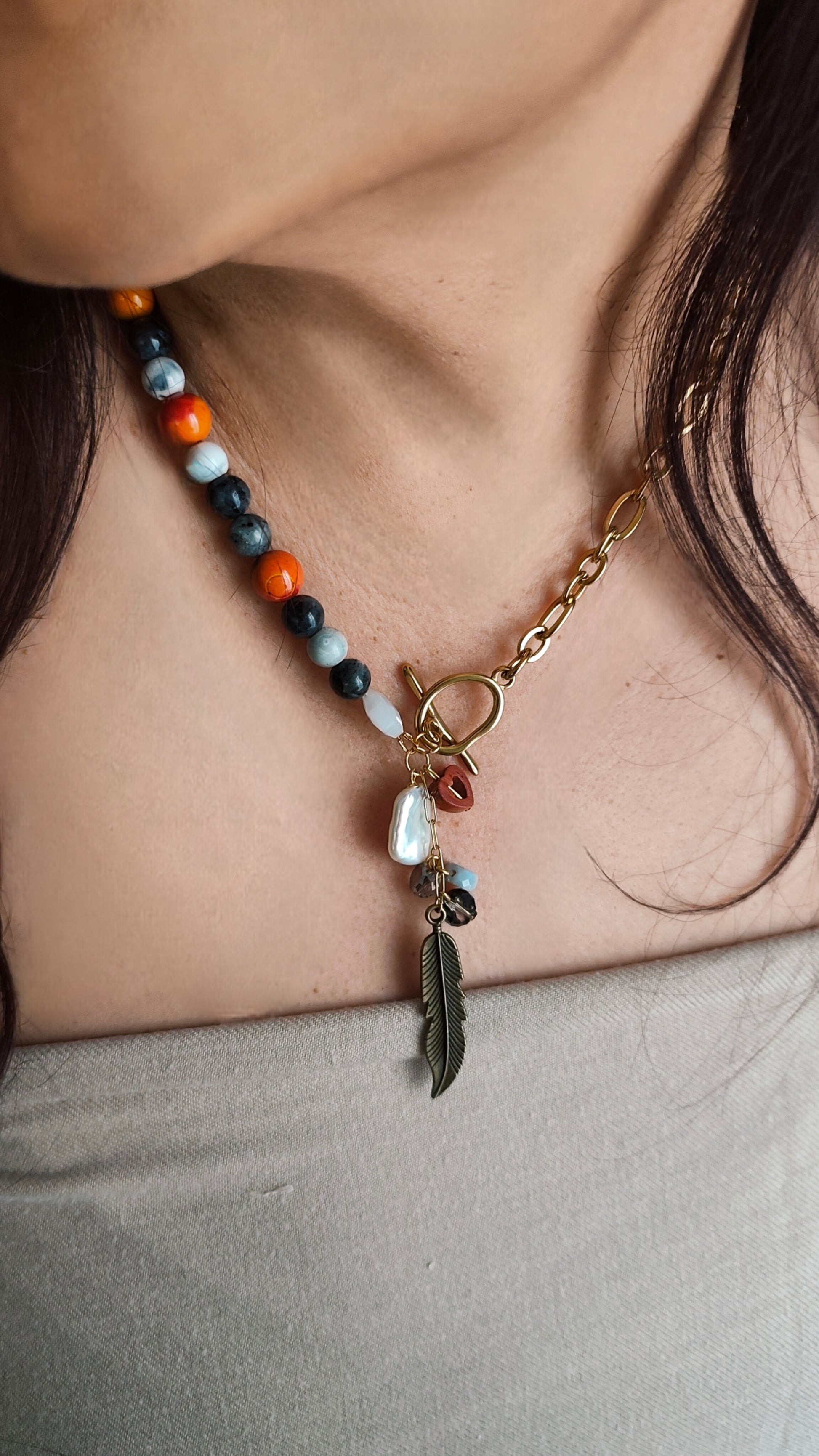 Un encuentro entre color, luz y delicadeza. Las perlas de labradorita reflejan destellos sutiles, mientras la ágata pintada a mano en naranja aporta profundidad y carácter. Los vidrios facetados en blanco iluminan la pieza, enlazados en una cadena de acero inoxidable dorado que abraza con elegancia.