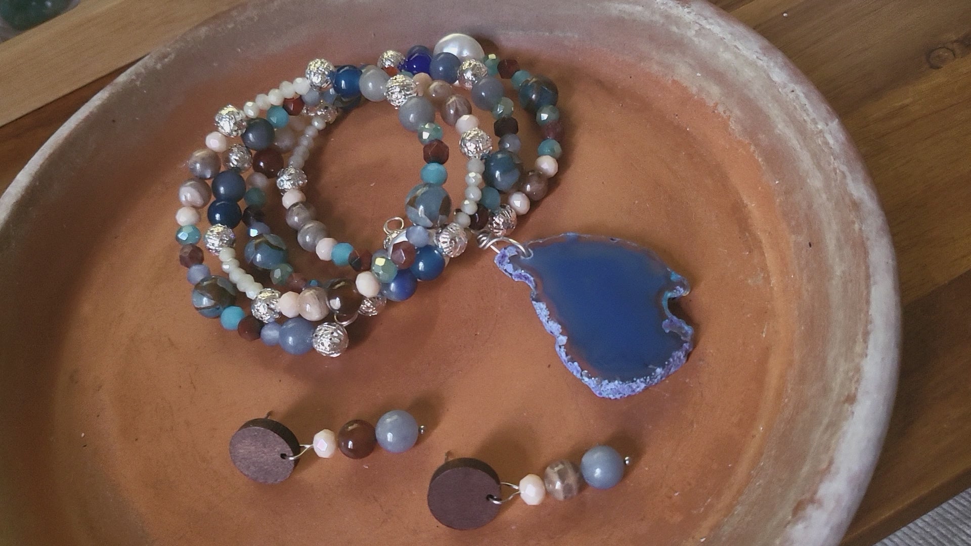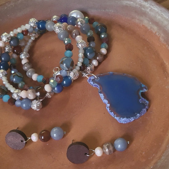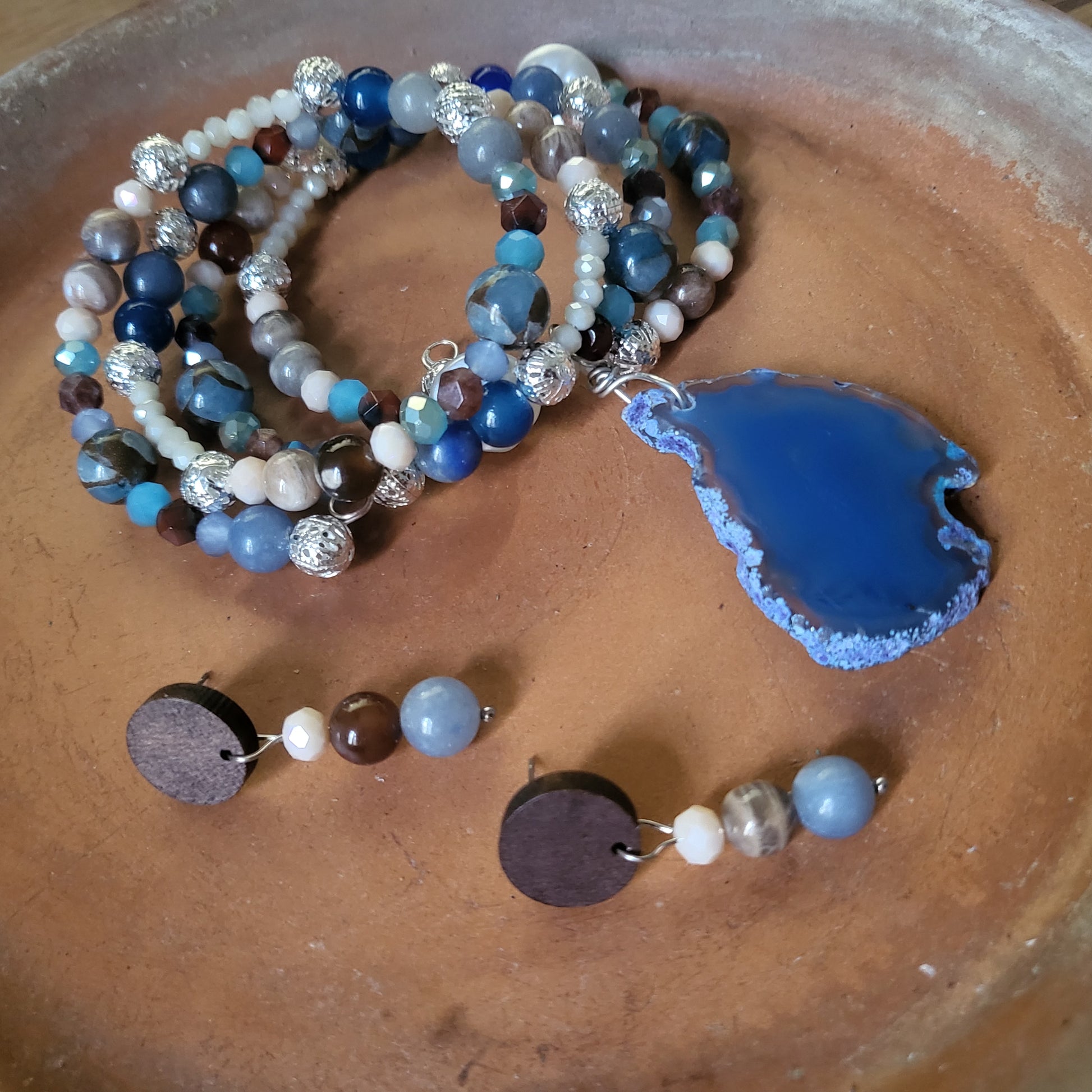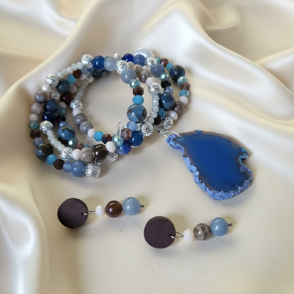 Plongez dans l'élégance de notre ensemble exclusif composé d'un bracelet mémoire et de boucles d'oreilles, un bijou qui allie tradition et style contemporain. Fabriqué à partir d'agate bleue, de pierres de jaspe cloisonné bleu de 8 mm et de jaspe marron de 6 mm, ainsi que de cristaux dans des tons marins et terreux, ce modèle évoque la richesse de la nature et de la culture mexicaine, rehaussée par un pendentif en agate bleue qui apporte une touche d'élégance à l'ensemble.