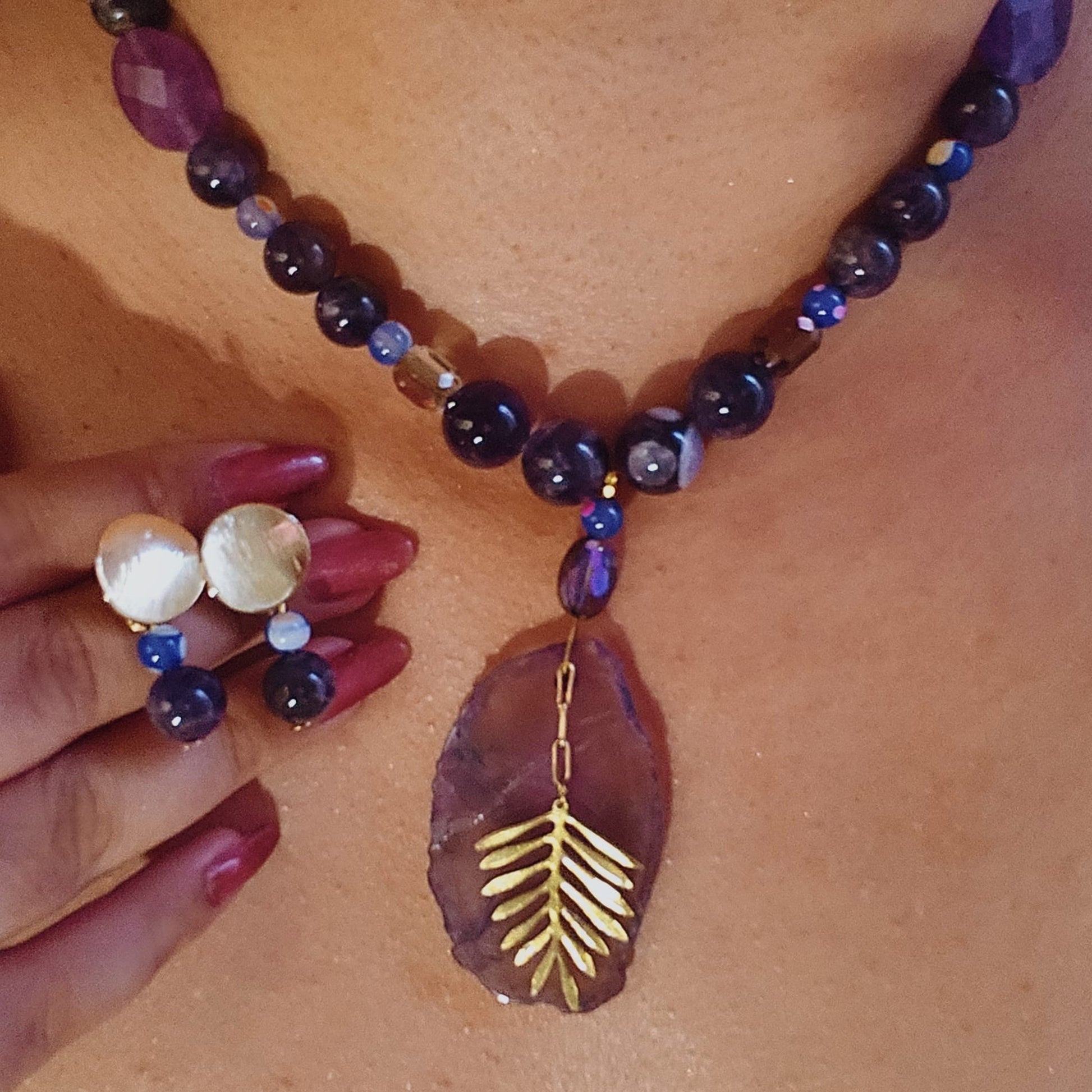 Le collier est composé de perles de quartz violet (#10) et de perles d'améthyste mates (#12), entrelacées de maillons facettés en quartz violet et de délicates perles d'agate de feu bleues. Au centre, un pendentif en agate naturelle “violeta” apporte équilibre et présence unique au design.